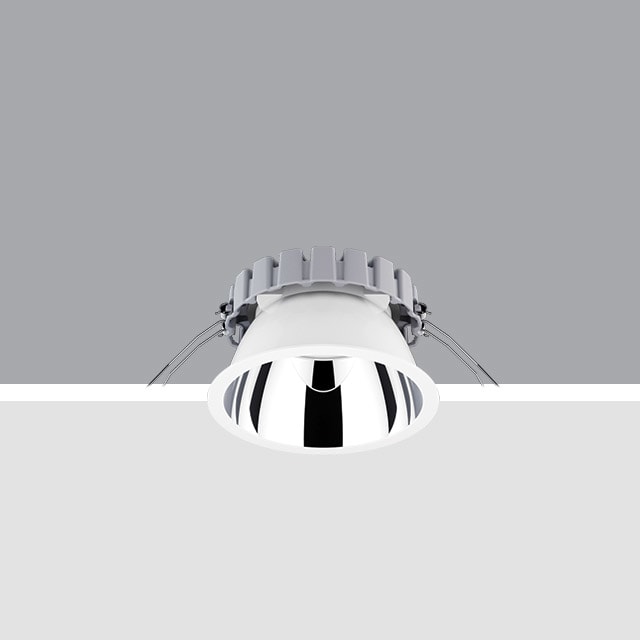Apparecchio rotondo fisso finalizzato all'utilizzo di sorgente LED con tecnologia C.o.B. Versione con falda per installazione ad appoggio. Riflettore metallizzato con vapori di alluminio sottovuoto con strato di protezione antigraffio. Dissipatore realizzato in alluminio pressofuso verniciato grigio. Prodotto completo di LED in tonalità di colore neutral white (4000K). Emissione luminosa UGR<19 L<3000 cd/mq ideale per ambienti dove sono presenti videoterminali. Potenza nominale [W]: 21. Flusso nominale [Lm]: 3450.