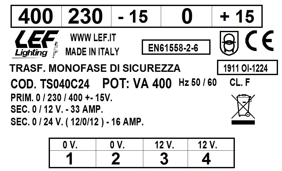 L.E.F. SRL - LEFTS040C24 TRASFORMATORE MONOFASE DI SICUREZZA 400VA 230.400V / 12÷24V