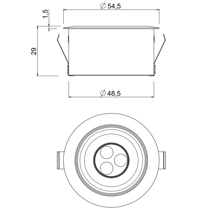 Apparecchi da incasso a LED, ideali per illuminazione generale e di effetto. Caratterizzati da un design discreto ed elegante e dalledimensioni ridotte, sono ideali per illuminare teche, vetrine o piccole nicchie. Esem Mini è installabile in controsoffitti di spessore da 5 mm a 25 mm, tramite molle in acciaio inox. Corpo in alluminio lega EN AW 6026 con trattamento di anodizzazione bianca. Cornice in alluminio lega EN AW 6026 con trattamento di anodizzazione bianca. FINITURA: Bianco opaco RAL9003. LED 3W 24Vdc 5000K. Ottica: Adjustable ±20°: L (30°).