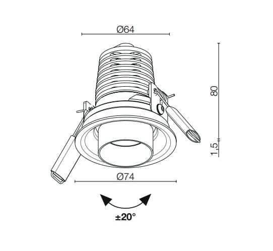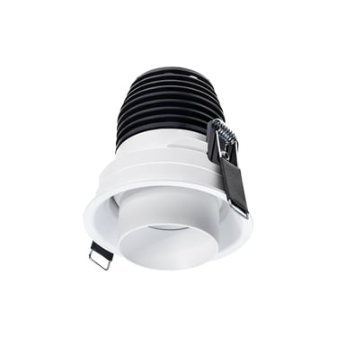 Incasso downlight da interno; a incasso (soffitto); corpo e ghiera (con cannocchiale) in alluminio lega EN AW 6082,schermo in PETG; finitura: bianco RAL 9003; 1 power LED multichip; 8W - 230Vac; alimentatore incluso e cablato; incluso cavo di 0,30 m; flusso totale: 436 lm (3000K); ottiche orientabili ±20°: 29°; colore LED: bianco -3000K; grado di protezione: IP40; temperatura di esercizio: 0°C +45°C; sicurezza fotobiologica: gruppo rischio 1 secondo EN62471:2006; classe di isolamento II; peso 0,25 kg; dimensioni Ø74x80 mm; foro d’incasso Ø65 mm; volume tecnico per dissipazione: Ø180x150 mm; dimmerazionedisponibile mediante DALI, 1-10V, PUSH.