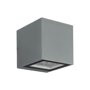 Kocca 3.2 - Applique da esterno; biemissione; su superficie (parete); corpo in alluminio pressofuso lega EN AB 47100, schermo in vetro temprato; finiture: grigio; matrice power LED; 21W (10 power LED) - 230Vac; alimentatore integrato; muffola per connessione con cavo di 0,50 m H05RN-F 2x0,75 Ø6,3 mm; ottica 30°; colore LED: bianco - 4000K; grado di protezione: IP65; grado di resistenza: IK05; temperatura di esercizio: -20°C +45°C; temperatura schermo: max 40°C (Ta 25°C); Glow Wire Test: 960°; sicurezza fotobiologica: gruppo rischio 1 secondo EN62471:2006; classe di isolamento I; peso 4,00 kg; dimensioni 150x150x170 mm; accessori: distanziale WD0400F. LED bianco 21W 4000K 30°.