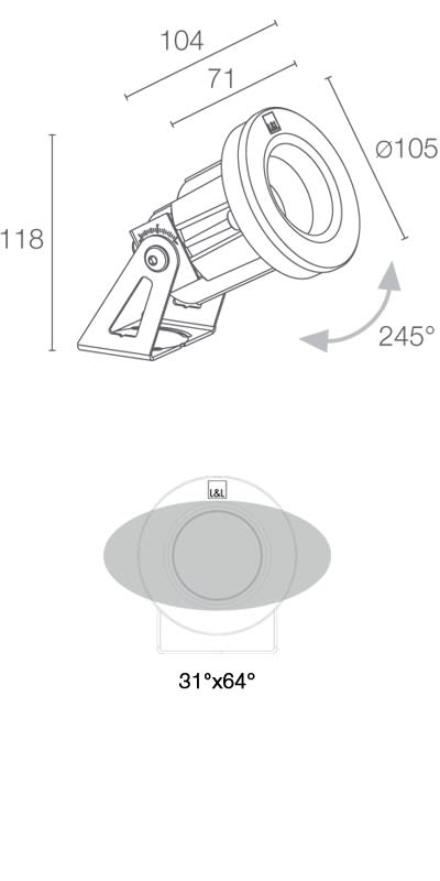 Proiettore da immersione (non adatto per immersione in acqua salata, non adatto per applicazioni fuori dall’acqua);su superficie (parete, pavimento); corpo in tecnopolimero termoconduttivo, ghiera in acciaio inox AISI 316L; schermoin vetro extrachiaro temprato; staffa in acciaio inox AISI 316L; finiture: acciaio inox microsabbiato. 9W. 4000 K. 34°. 359 lm