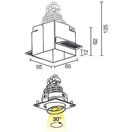 Apparecchio a incasso da interno a scomparsa di forma quadrata; 6W - 350/500mA; 3 power LED; 5000K; CRI: 75÷80; ottiche orientabili ±15°: 24°; corpo in alluminio lega EN AW 6012 con trattamento di anodizzazione, cornice in lamiera verniciata, schermo in PMMA ad alta riflettanza; finitura: verniciatura nero; temperatura di esercizio: 0°C +45°C; temperatura vetro: max 40°C (Ta 25°C); parte metallica max 60°C; grado di protezione contro i liquidi e i corpi solidi: IP40; sicurezza fotobiologica: gruppo rischio 1 secondo EN62471:2006; montaggio a incasso su struttura in cartongesso con cassaforma WC2001, molle presenti nel corpo emissione; classe di isolamento III; peso 0,30kg; dimensioni 65x65x130mm; foro d'incasso 65x65mm; volume d'ingombro 165x165x150mm; collegamento in serie, non cablato, presente morsettiera; dimmerazione disponibile mediante alimentatore dimmerabile.