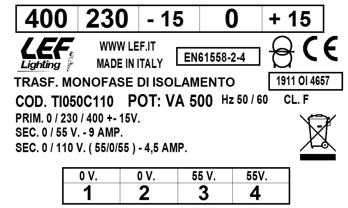 L.E.F. SRL - LEFTI050C110 TRASFORMATORE MONOFASE 500VA 230.400V / 55÷110V - TI050C110