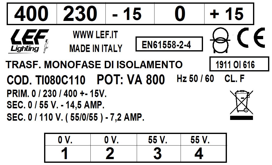 L.E.F. SRL - LEFTI080C110 TRASFORMATORE MONOFASE 800VA 230.400V / 55÷110V - TI080C110