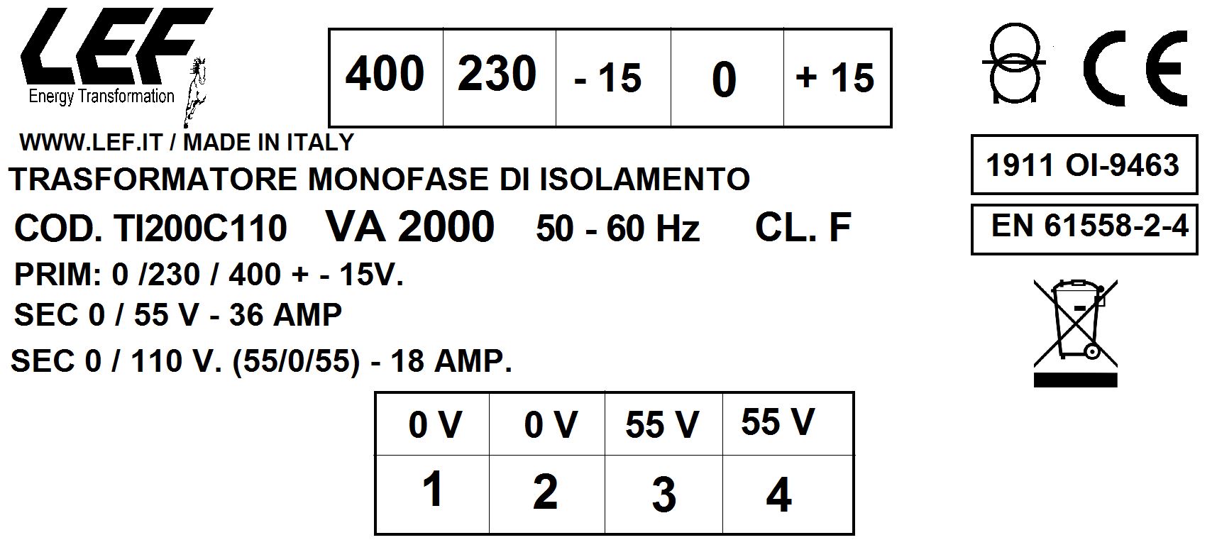 L.E.F. SRL - LEFTI200C110 TRASFORMATORE MONOFASE 2000VA 230.400V / 55÷110V - TI200C110