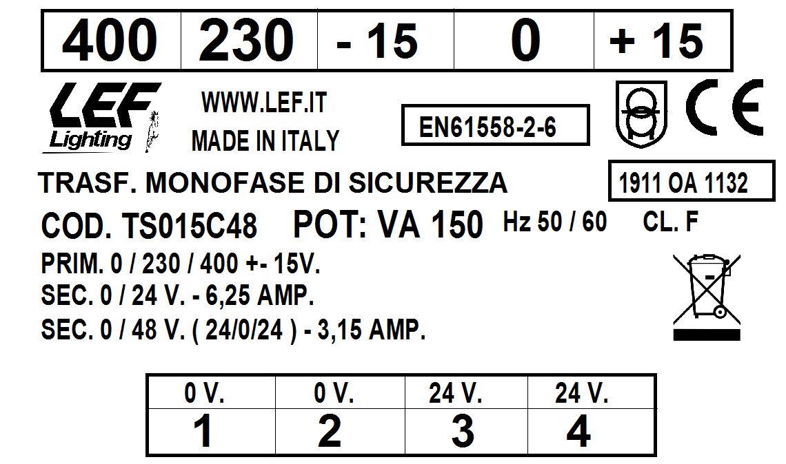 L.E.F. SRL - LEFTS015C48 TRASFORMATORE MONOFASE DI SICUREZZA 150VA 230.400V / 24-48V - TS015C48