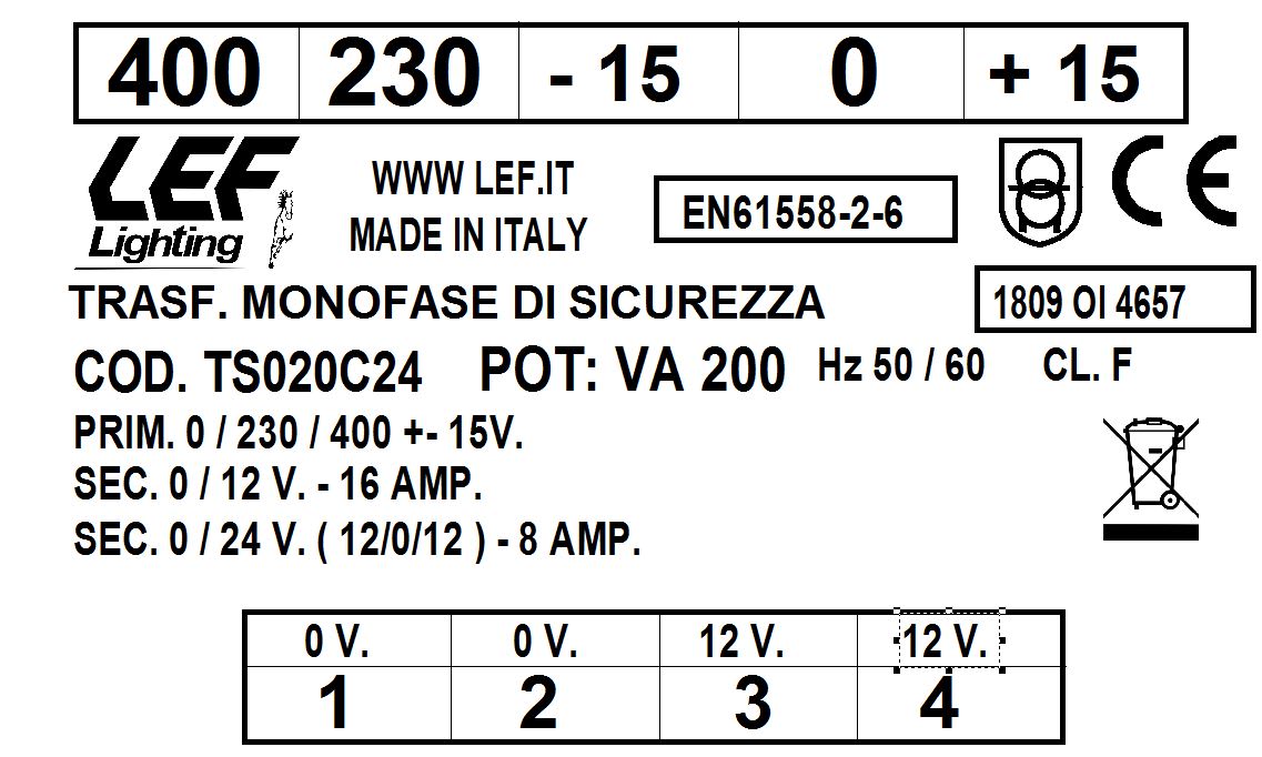 L.E.F. SRL - LEFTS020C24 TRASFORMATORE MONOFASE DI SICUREZZA 200VA 230.400V / 12÷24V - TS020C24