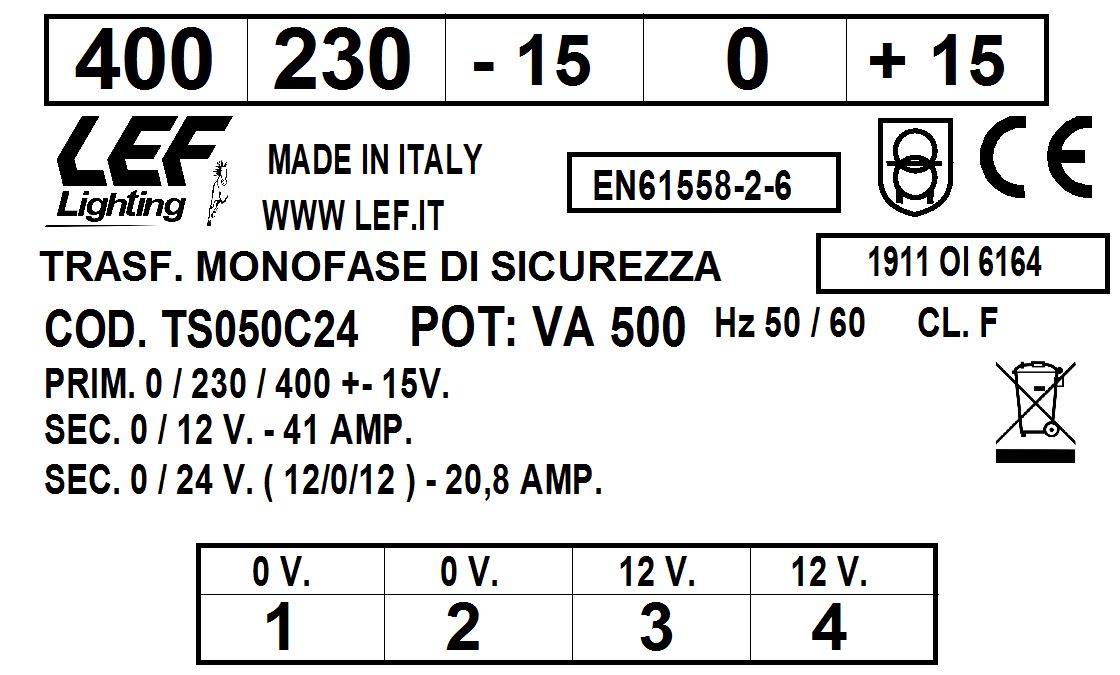 L.E.F. SRL - LEFTS050C24 TRASFORMATORE MONOFASE DI SICUREZZA 500VA 230.400V / 12÷24V