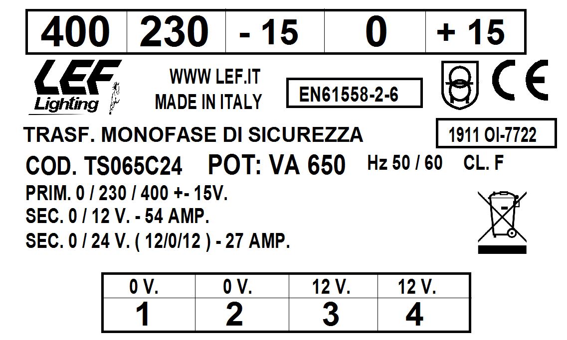 L.E.F. SRL - LEFTS065C24 TRASFORMATORE MONOFASE DI SICUREZZA 650VA 230.400V / 12÷24V - TS065C24
