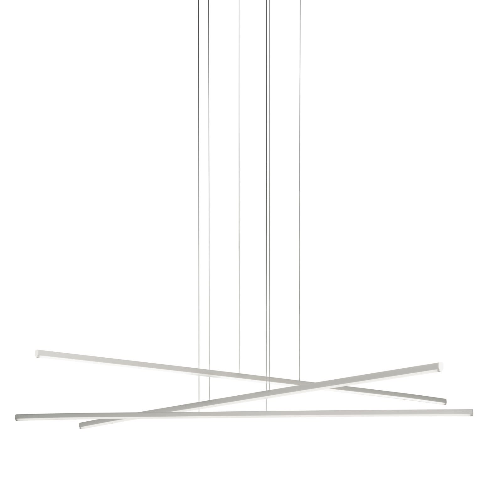 Straight_P3 - Sospensione a doppia emissione per applicazione indoor. La sorgente luminosa LED, di colore bianco caldo, con distribuzione luminosa General Lighting, è composta da 100 LED topled, con una CCT 2700 K ed un CRI 90; il flusso luminoso della sorgente è di 4557 lm, con un'efficienza nominale di 134.0 lm/W ed una durata operativa (L80) di 80000 ore. Il corpo dell'apparecchio, realizzato in alluminio, presenta una finitura di colore bianco ral 9003 goffrato, ottenuta tramite verniciatura; il diffusore è prodotto in policarbonato; la montatura è prodotta in ferro, con una finitura di colore bianco ral 9003 goffrato, ottenuta tramite verniciatura. Il grado di protezione è IP20; il peso complessivo è di 0.943 kg. Il driver di alimentazione è inclusonella confezione. La potenza assorbita dall'apparecchio è di 34 W, e viene fornita da un driver specifico con range operativo 220V - 240V / 60Hz - 50Hz. L'apparecchio presenta una classe di isolamento I ed è installabile a soffitto. LED 34W 4557 lm 2700K CRI 90 1050mA - 129°-148°.