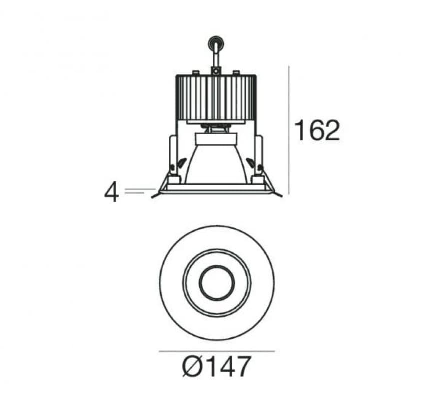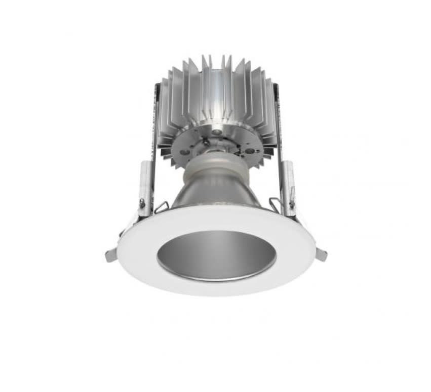 Downlight a singola emissione per applicazione indoor. La sorgente luminosa LED, di colore bianco caldo, con distribuzione luminosa 60°, ècomposta da 1 LED arrayled, con una CCT 3000 K ed un CRI 80; il flusso luminoso della sorgente è di 3346 lm, con un'efficienza nominaledi 133.8 lm/W. Il corpo dell'apparecchio, realizzato in policarbonato, presenta una finitura di colore bianco ral 9003, ottenuta tramite verniciatura. Il grado di protezione è IP20; il peso complessivo è di 0.712 kg. Il driver d’alimentazione non è fornito e deve essere ordinato separatamente. La potenza assorbita dall'apparecchio è di 25 W. Il cavo per l'alimentazione è incluso e presenta una lunghezza di 0.3 m. L'apparecchio presenta una classe di isolamento III ed è installabile a soffitto, con foro tondo di diametro 129 mm (nel cartongesso).