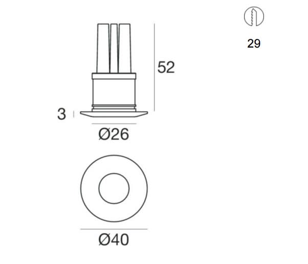Downlights a singola emissione per applicazione indoor. La sorgente luminosa LED, di colore bianco naturale, con distribuzione luminosa 15°, è composta da 1 LED powerled, con una CCT 4000 K ed un CRI 80; il flusso luminoso della sorgente è di 222 lm, conun'efficienza nominale di 111.0 lm/W ed una durata operativa (L) di 80000 ore. Il corpo dell'apparecchio, realizzato in ottone, presenta una finitura di colore bianco ral 9010, ottenuta tramite verniciatura. Il grado di protezione è IP40; il peso complessivo è di 0.066 kg. Il driver d’alimentazione non è fornito e deve essere ordinato separatamente. La potenza assorbita dall'apparecchio è di 2,0 W. Il cavo per l'alimentazione è incluso e presenta. L'apparecchio presenta una classe di isolamento III ed è installabile a parete o soffitto, con foro tondo di diametro 29 mm (nel cartongesso) su muratura con controcassa cod. 84901.