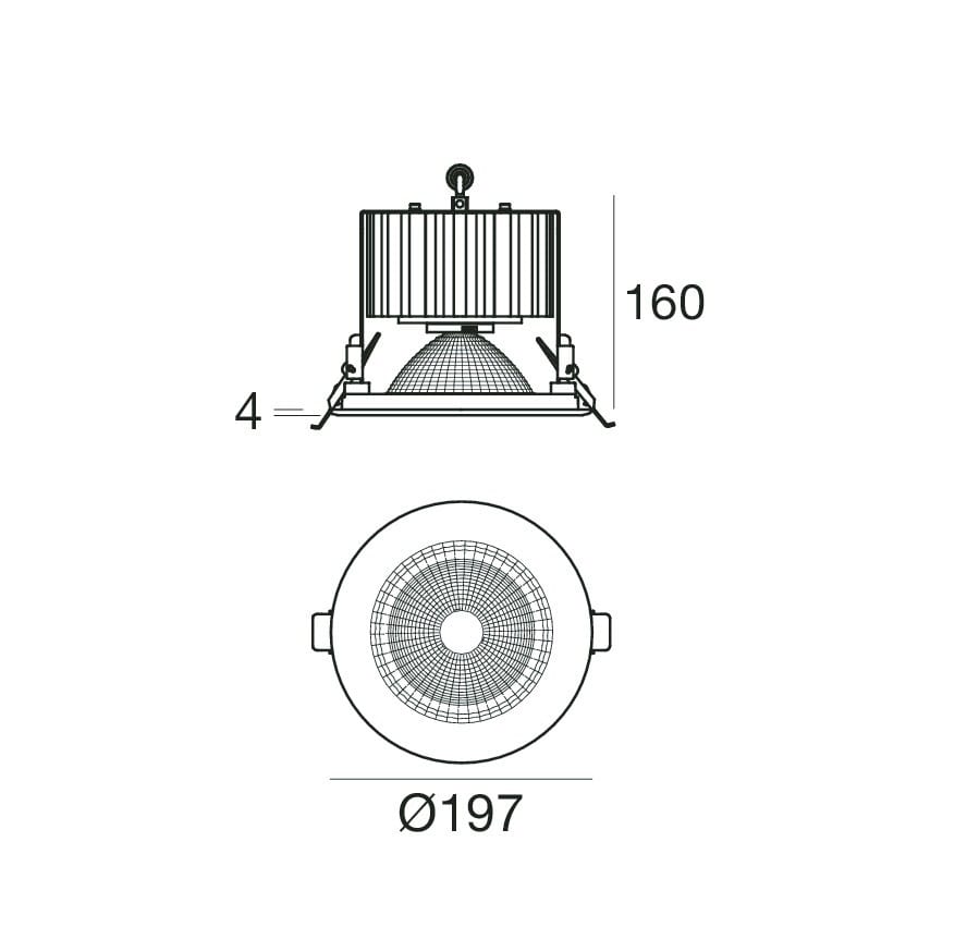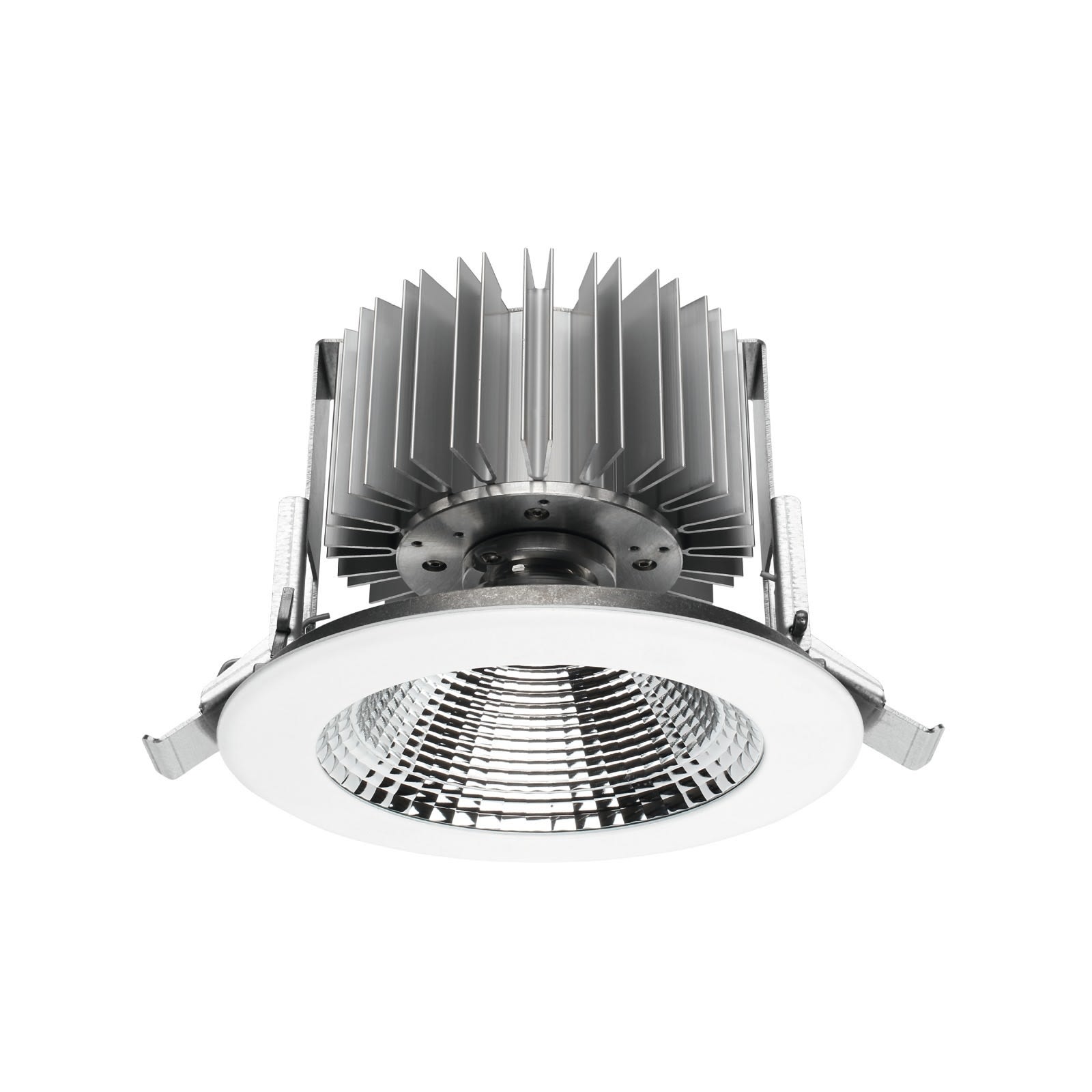 Downlights a singola emissione per applicazione indoor. La sorgente luminosa LED, di colore bianco caldo, con distribuzione luminosa 40°, è composta da 1 LED arrayled, con una CCT 3000 K ed un CRI 80; il flusso luminoso della sorgente è di 3861 lm, con un'efficienza nominale di 128.7 lm/W. Il corpo dell'apparecchio, realizzato in policarbonato, presenta una finitura di colore bianco ral 9003 goffrato, ottenuta tramite verniciatura. Il grado di protezione è IP20; il peso complessivo è di 1.5 kg. Il driverd’alimentazione non è fornito e deve essere ordinato separatamente. La potenza assorbita dall'apparecchio è di 30 W. Il cavo per l'alimentazione è incluso e presenta. L'apparecchio presenta una classe di isolamento III ed è installabile a soffitto, con foro tondo di diametro 180 mm (nel cartongesso).