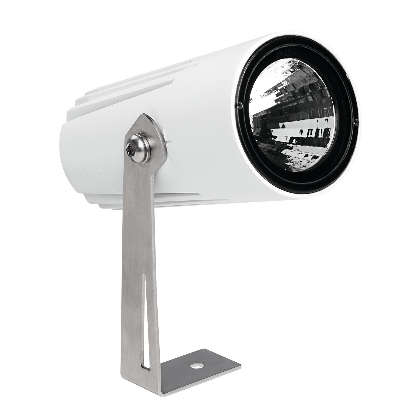 Proiettori a singola emissione per applicazione outdoor. La sorgente luminosa LED, di colore bianco caldo, con distribuzione luminosaMedium Flood, è composta da 1 LED arrayled, con una CCT 3000 K ed un CRI 80; il flusso luminoso della sorgente è di 680lm, con un'efficienza nominale di 113.3 lm/W. Il corpo dell'apparecchio, realizzato in alluminio, presenta una finitura di colore bianco ral 9003 goffrato, ottenuta tramite verniciatura; il diffusore è prodotto in vetro, con una lavorazione di serigrafia. Il grado di protezione è IP66; il peso complessivo è di 0.4 kg. Il driver di alimentazione è incluso nella confezione. La potenza assorbita dall'apparecchio è di 6 W, e viene fornita da un driver specifico con range operativo 100V - 240V / 50Hz - 60Hz. Il cavo per l'alimentazione è incluso e presenta. L'apparecchio presenta una classe di isolamento II ed è installabile a parete, soffitto o pavimento.