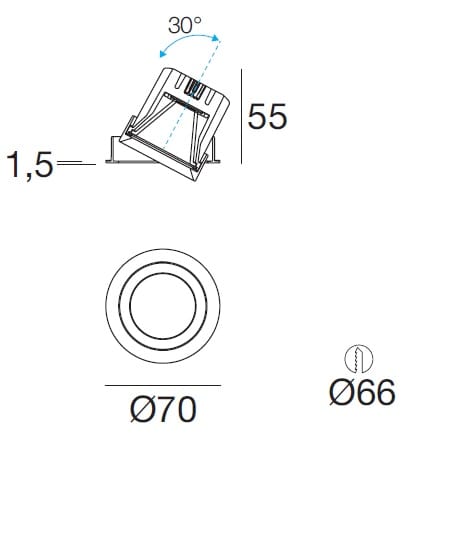 L'apparecchio presenta una classe di isolamento III ed è installabile a soffitto, con foro tondo di diametro 66 mm (nel cartongesso).