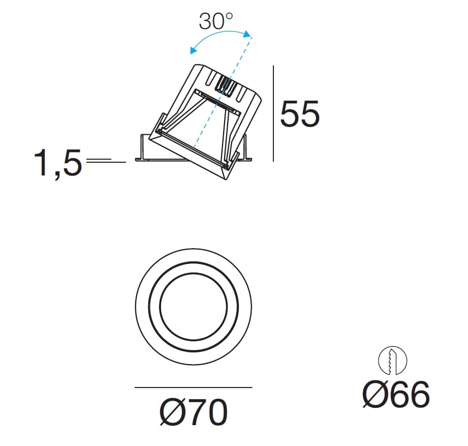 L'apparecchio presenta una classe di isolamento III ed è installabile a soffitto, con foro tondo di diametro 66 mm (nel cartongesso).