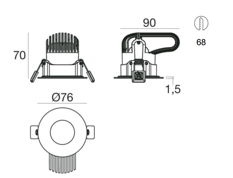 L'apparecchio presenta una classe di isolamento III ed è installabile a soffitto, con foro tondo di diametro 68 mm (nel cartongesso).