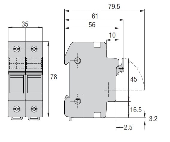 Tensione nominale 1000VDC / 690VAC , corrente nominale 32A , categoria di utilizzo DC-20B 1000VDC, AC-21B 690V , adatti per fusibili 10x38 gPV , sezione massima 16mm2 cavi flessibili, collegabile 25mm2 cavi rigidi.Conformità IEC/EN 60947-1, IEC/EN 60947-3 Conformità alla direttiva RoHS.