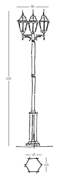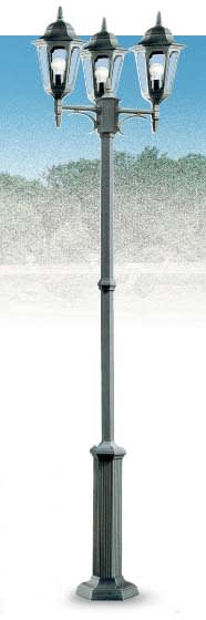 Lampione 3 luci in pressofusione di alluminio. Diffusore: Glass Trasparente (versione standard). Colori struttura: Nero verde. Lampada ad incandescenza 3x 100W E27 / Fluorescente compatta 3x 23W E27.