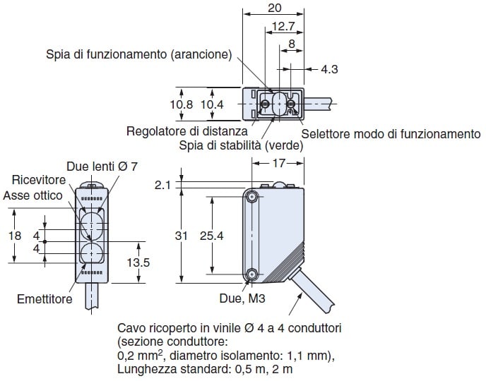 Sensore fotoelettrico laser E3ZLL81, miniatura radiale, reflex BGS 20... 300 mm, uscita PNP impulso-luce/buio, cavo 2 m, tempo risposta 1 ms