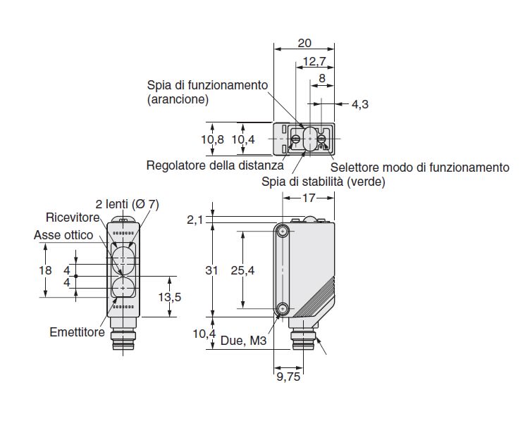 Sensore fotoelettrico E3ZLS81, miniatura, radiale, reflex BGS/FGS 0.2m, uscita PNP impulso-luce/buio, connettore M8