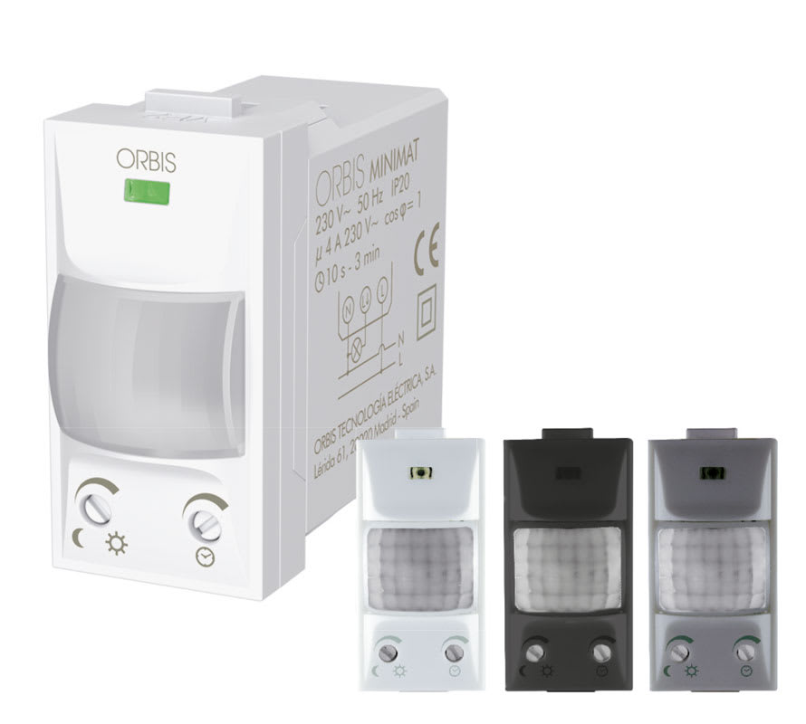 MINIMAT - Rivelatore di presenza tipo PIR da incasso un modulo serie civile, compatibile con le principali serie con un sistema di adattatori intercambiabili + tre frontalini colore Bianco, Antracite e Alluminio inclusi nella confezione. Regolazione della luminosità e ritardo allo spegnimento. Tecnologia “Zero crossing”.