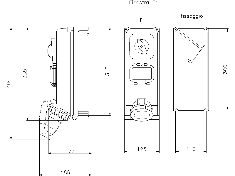 Presa da parete con interruttore di blocco, guida EN50022 e sportello trasparente in contenitore modulare in lega di alluminio IP67 >>IK10. Passaggio lato superiore con finestra tipo F1. Vano da 4 moduli EN 50022. Manopola lucchettabile.