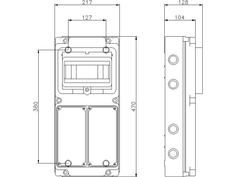 Quadri stagni flangiati per installazione a parete o ad incasso di prese da 16A e 32A con interruttore di blocco e guida EN50022 per fissaggio di apparecchi modulari. N° prese installabili: 2. N° moduli EN50022: 8. Potenza dissipabile: 40W. Dimensioni: 217x470 mm. Grado di protezione IP55