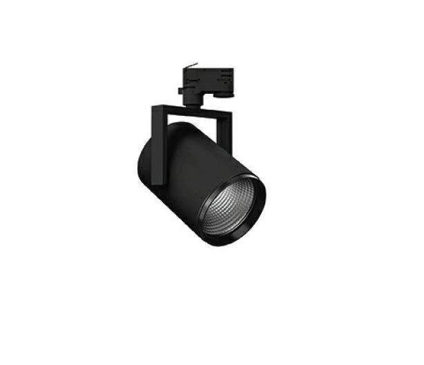 Proiettore LED da binario per interni, costituito da: Corpo faretto in profilo d'alluminio estruso e pressofuso, vernicato a polvere. Corpo faretto rotante e basculante. Riflettore in alluminio purissimo con sfaccettature sferiche ad alta brillantezza per il massimo rendimento della lampada ed una resa cromatica neutra. Anello con chiusura a baionetta per la sostituzione senza utensili del riflettore e del blocco ottico. Tolleranza cromatica (MacAdam) ≤ 3 SDCM. Indice di resa cromatica > 80. Lifetime LED60.000 h al 80% del flusso luminoso (L80B10). Completo di adattatore trifase universale. Completo di alimentatore elettronico. Il montaggio a soffitto non richiede l'uso di utensili. Completo di vetro di protezione. Colore / RAL: BK-RAL9005 / Nero RAL9005 / Goffrato. Angolo Ottica: 2 x 8°. Lampada: LED 20W 2890Lm 4000K.