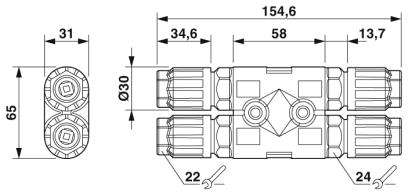 Innovativo e rapido: connessione rapida QUICKON per un risparmio di tempo fino all'80 % durante la connessione in loco. Pratico: confezionamento semplice e rapido senza utensili speciali. Estremamente robusto: custodia con gradi di protezione IP68/IP69K e IK07 per un ampio range di impiego. Connessione sicura grazie alla polarizzazione contro le inserzioni errate e la protezione antinfortunistica a norma DIN EN 0105. Flessibile e compatto: grazie al cablaggio interno delle connessioni, i distributori a He a T possono essere utilizzati per la diramazione di linee principali oppure come distributori a stella.