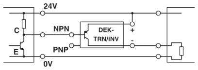 Modulo invertito. Il modulo è preposto alla conversione dei segnali d’uscite transistor NPN in uscite PNP con interruzione del segnale positivo, così come segnali con interruzione PNP in segnali con commutazione NPN con interruzione del segnale negativo (vedere esempio applicativo).