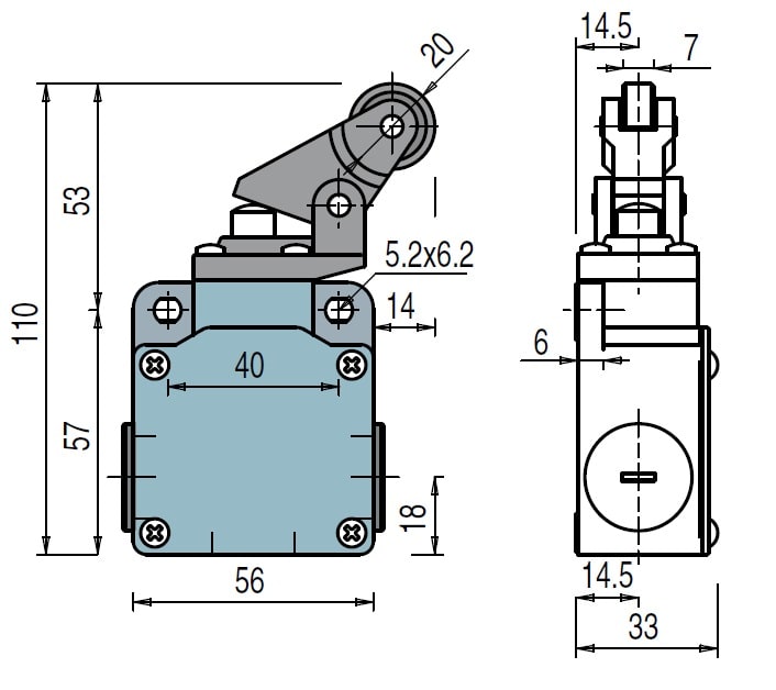 Interruttore di posizione a leva angolare con rotella, Custodia metallica, tre entrate cavi filettate, IP67 secondo IEC 60529 con pressacavo avente grado di protezione uguale o superiore, 1NO+1NC scatto rapido, con apertura positiva.