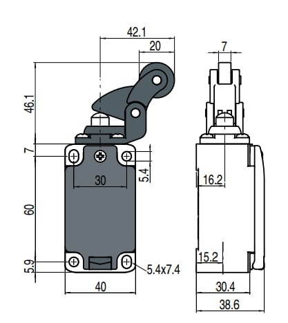 Interruttore di posizione a leva angolare con rotella. Custodia: Custodia in tecnopolimero, una entrata cavi filettata PG 13,5. Unità di contatto: 1NO+1NC scatto rapido (B5). Testa: A leva angolare con rotella. Grado di protezione: IP67 secondo EN 60529.Apertura positiva: Sì
