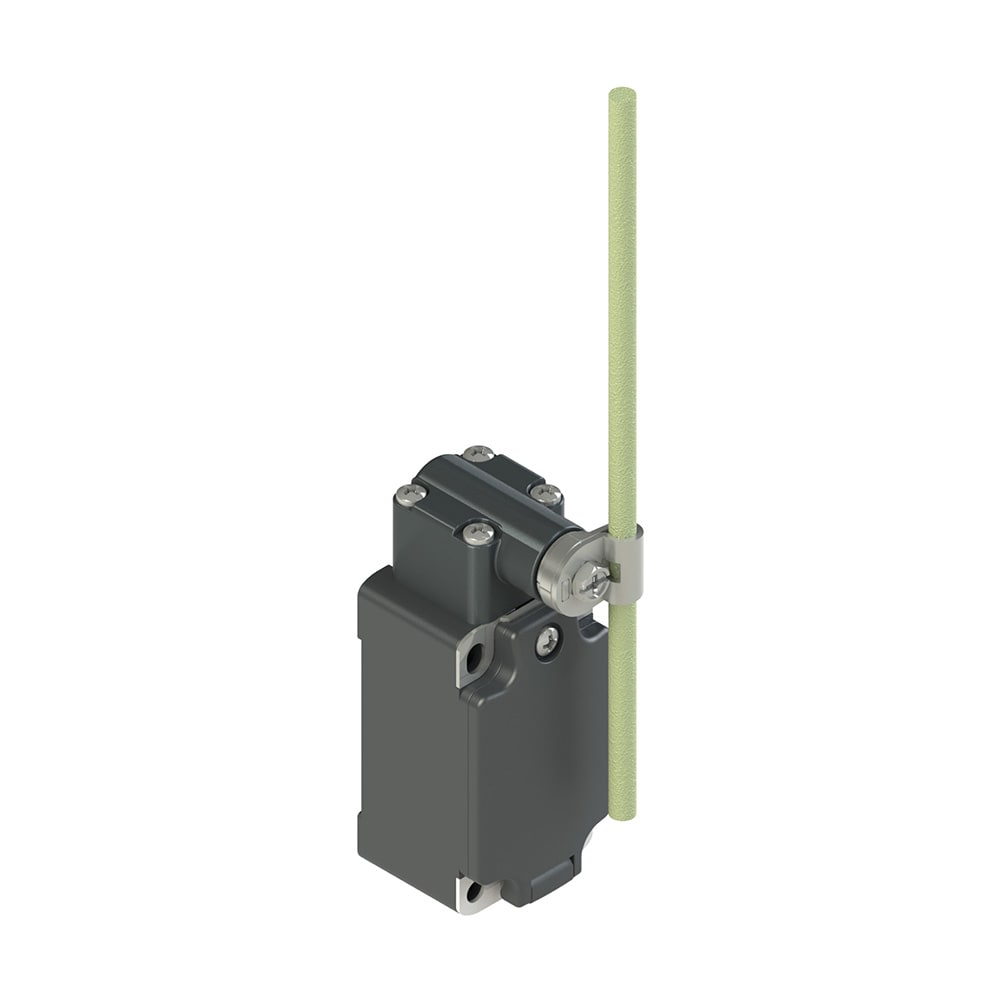 Interruttore di posizione a leva girevole con asta fibra vetro regolabile. Custodia: Custodia in tecnopolimero, una entrata cavi filettata PG 13,5. Unità di contatto: 1NO+1NC scatto rapido (B5). Testa: A leva girevole con asta fibra vetro regolabile. Grado di protezione: IP67 secondo EN 60529.