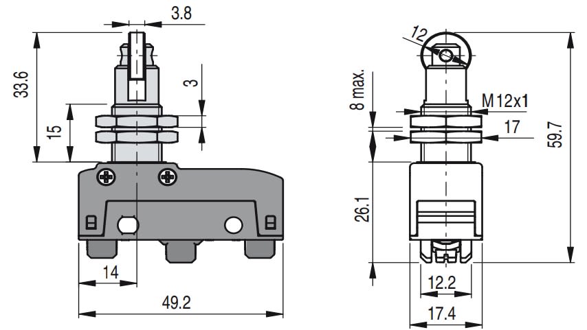 Microinterruttore a pulsante filettato con rotella trasversale. Temperatura ambiente: Da -25°C a +85°C. Custodia: Custodia in tecnopolimero rinforzato con fibra di vetro, autoestinguente ed antiurto. Tipo di terminale: A vite con piastrina autosollevante. Unità di contatto: 1NO+1NC, scatto rapido in deviazione. Grado di protezione massimo: IP40 con copriterminali. Tipo di azionamento: Azione diretta. Azionatore: A pulsante filettato con rotella trasversale. Apertura positiva: Sì