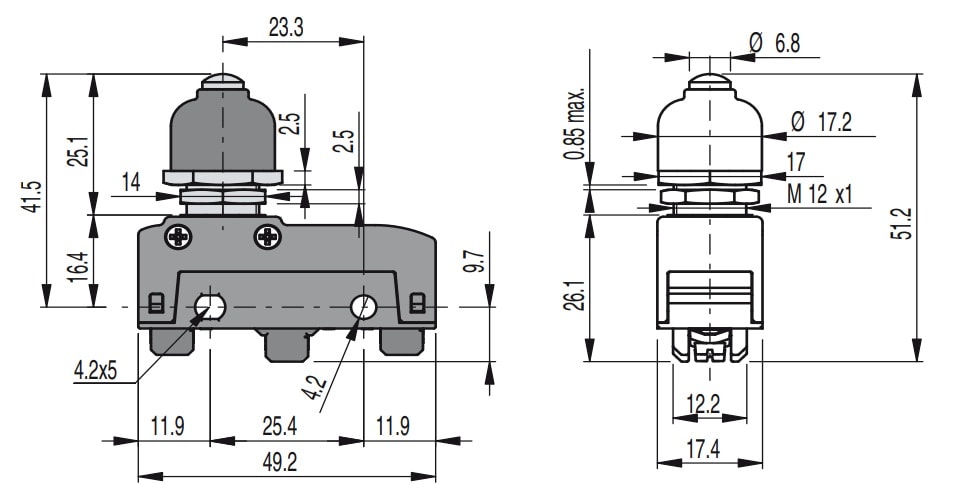 Microinterruttore a pulsante protetto. Temperatura ambiente: Da -25°C a +85°C. Custodia: Custodia in tecnopolimero rinforzato con fibra di vetro, autoestinguente ed antiurto. Tipo di terminale: A vite con piastrina autosollevante. Unità di contatto: 1NO+1NC, scatto rapido in deviazione. Grado di protezione massimo: IP65 con copriterminali. Tipo di azionamento: Azione diretta. Azionatore: A pulsante protetto. Apertura positiva: Sì