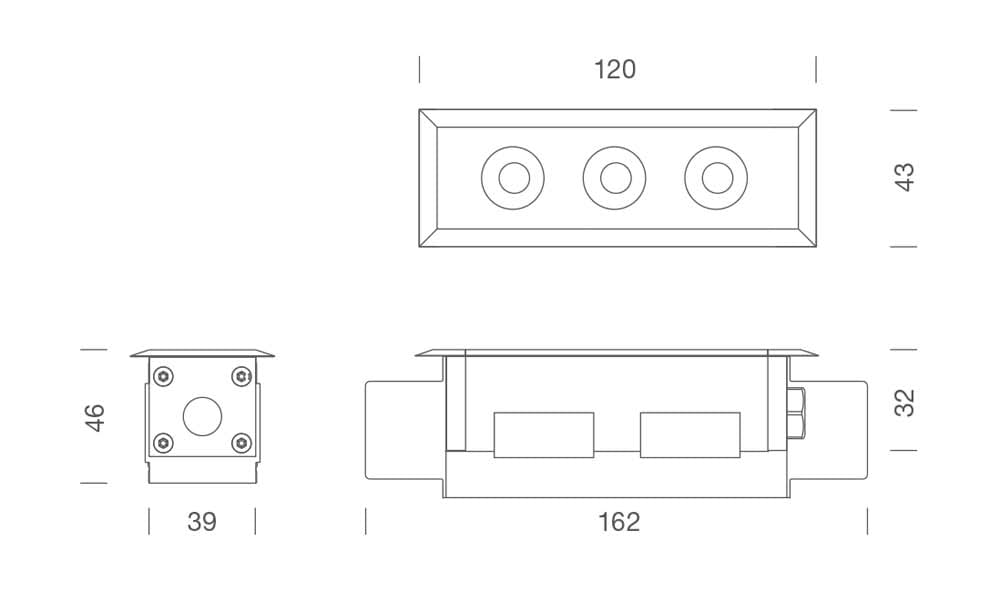 MINI CORNICHE 100 Incasso a pavimento - Corpo in lega di alluminio estruso verniciato e resistente alla corrosione. Viti in acciaio inox A4. Protezione con trattamento di anodizzazione, fondo con polveri epossidiche e verniciatura poliestere. Alimentazione da realizzare esternamente con trasformatore a tensione continua da 24V DC. Valvola Gore per impedire la formazione di condensa all'interno del prodotto. Ottica: Ellittica. LED Bianco 3W 375lm 3000K. Colore: Grigio.