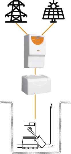EPS 2500 - Kit completo centrale antiallagamento senza galleggiante a doppia uscita alternata, con elettropompe; il kit comprende: centrale antiallagamento EPS 2500, batterie sigillate, battery box ABS (2x45 - 2x60 - 1x100) Ah, kit collegamento batterie in omaggio, 2 elettropompe sommergibili, galleggianti di comando. • Singola o doppia uscita • Realizzato su struttura portante in acciaio e rivestimento in ABS autoestinguente • Gestione a doppio microprocessore multilingua • Display multifunzioni (tensione rete, batteria, corrente di ricarica, potenza erogata, storico e altre funzioni) • Controllo amperometrico intelligente a riarmo automatico (salvamotore) • Controllo e gestione ricarica delle batterie (7 livelli di ricarica) • Autotest manuale e programmabile • Segnalazione acustica e ottica elettropompa in avaria (sovraccarico) • Contatto segnalazione elettropompa in avaria (sovraccarico) • Contatto per collegamento galleggiante di sicurezza • Funzione ECO-MODE in presenza del kit fotovoltaico