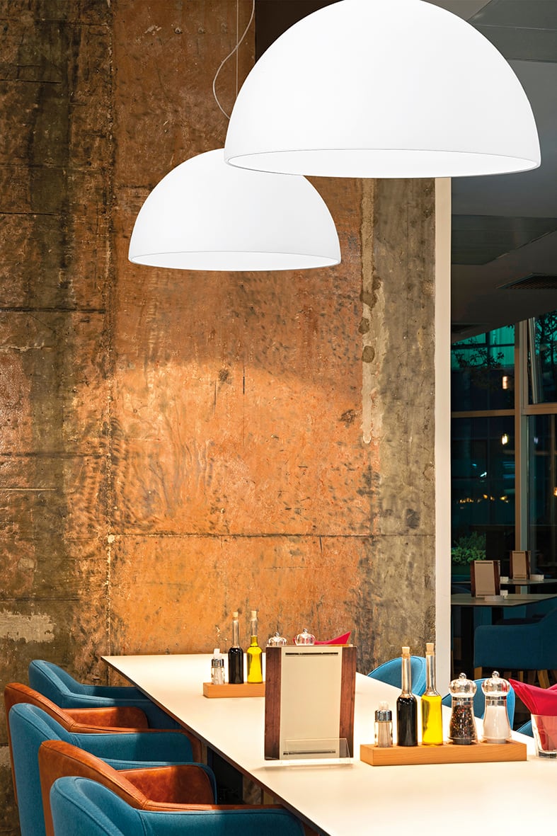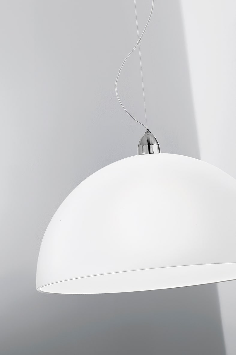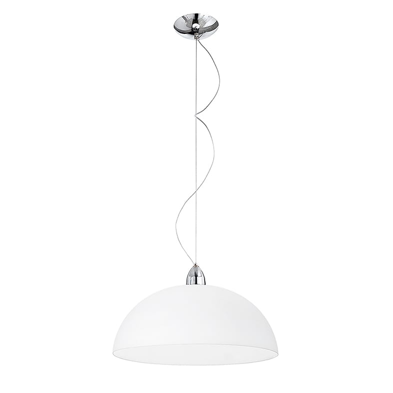 Lampada a sospensione a semisfera in vetro biancosatinato per un'ottima diffusione della luce con montatura e rosone in metallo cromato. Disponibilein due dimensioni. Attacco E27 che consente di mont are lampadina a LED.
