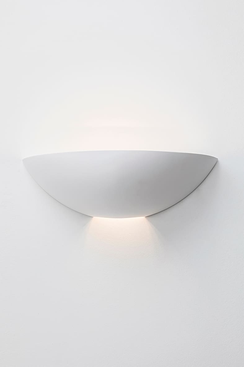 Lampada da parete in gesso nelle versioni monoemis sione a luce indiretta o biemissione, proposta informa tondeggiante e in diverse dimensioni. Struttura in gesso, che consente la pittura del corpo in finitura colore a propria scelta. Attacco R7s o E 27,che consentono di montare lampadina LED.