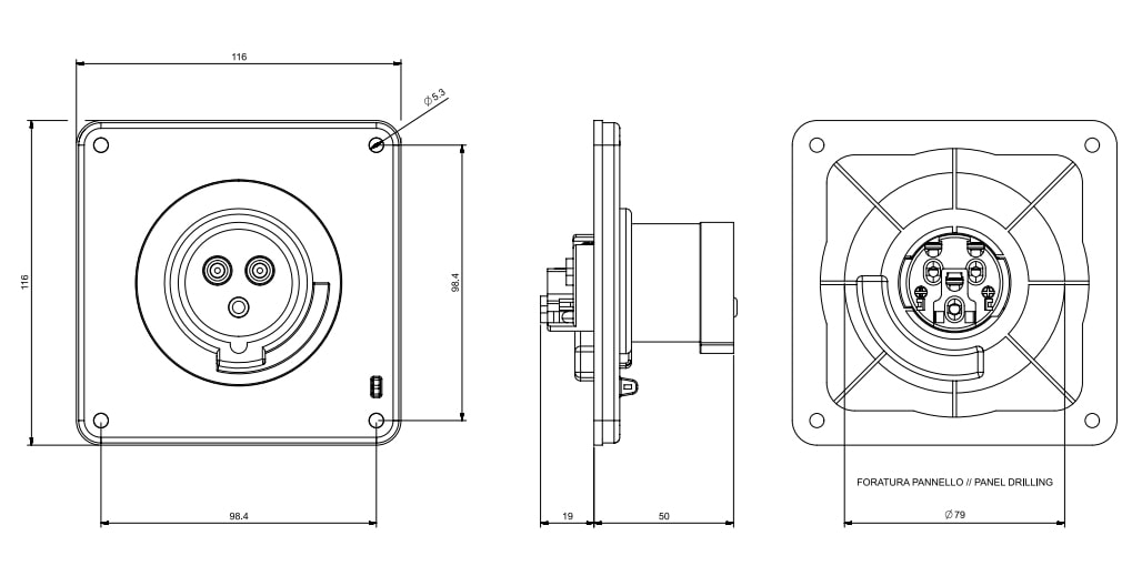 20A 2P 3W 6h 250V 120X120MM Morsetti a vite
