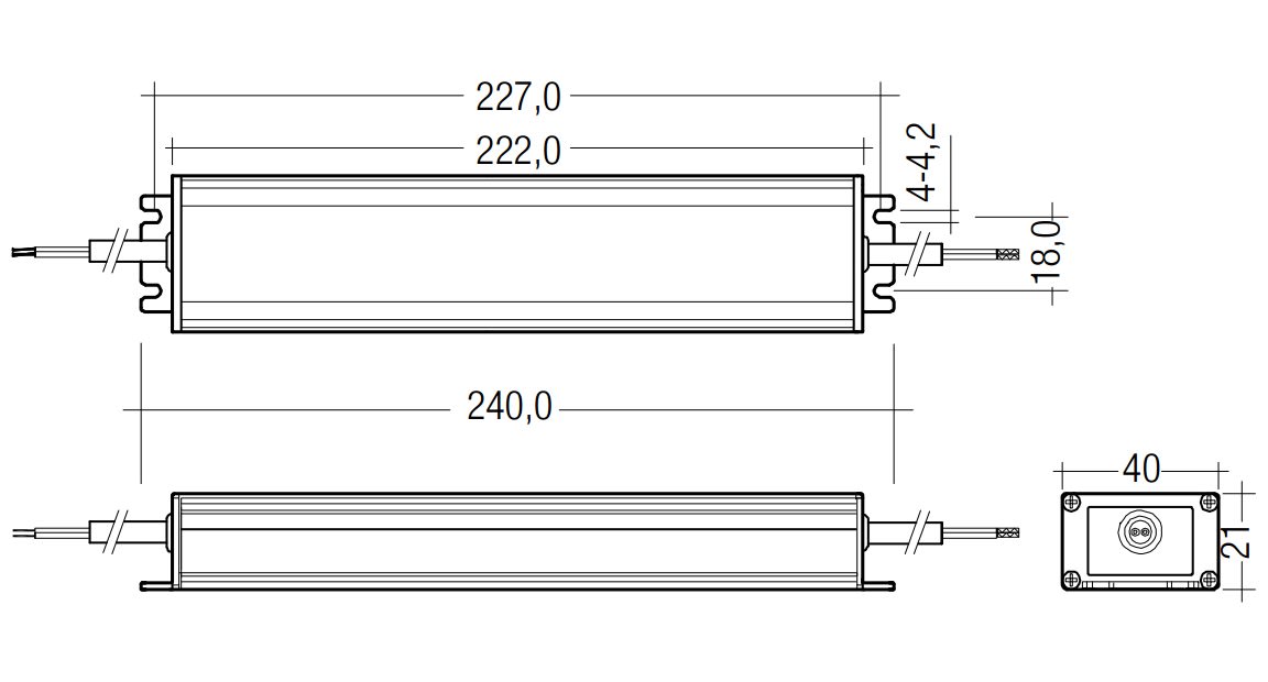 TALEXdriver LCU 60W 12/24V IP67 EXC. LED Driver a tensione costante. Tensione di alimentazione universale. Tensione in uscita costante. Collegamento: cavo con puntalini (lunghezza circa 500 mm). Identificatori di polarità sul secondario: + rosso / - nero. Copertura metallico, resinato. Durata vita nominale di max. 50.000 h (con ta 50 °C con un tasso di mal funzionamento ≤ 0,2 % per 1.000 h). 5 anni di garanzia.