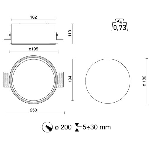 Installazione: Incasso a Soffitto. foro incasso: Foro di incasso diam.200 mm. Spessore controsoffitto: 5-30 mm. fissaggio: Con staffe regolabili in dotazione. Corpo / struttura: Corpo in lamiera di acciaio. verniciatura: Verniciatura per interni in polveri epossidiche. Colore: Bianco. Vetro / schermo: Schermo diffusore in policarbonato opale. Pressacavo: Fermacavo in nylon 66. Alimentatore: alimentatore integrato per diodi LED, uscita stabilizzata 700mA dc.Tensione: 220-240V 50/60Hz. Fascio luminoso: Simmetrico diffondente. Classe isolamento: Classe 2. Peso: 0,730 kg. Grado IP: 20. Filo incandescente: 650 °C. Lampada inclusa: si. Tipo LED: SMD LED potenza lampada: 13 W flusso lampada: 1700 lm temperatura di colore: 3000°K indice resa cromatica: 80.