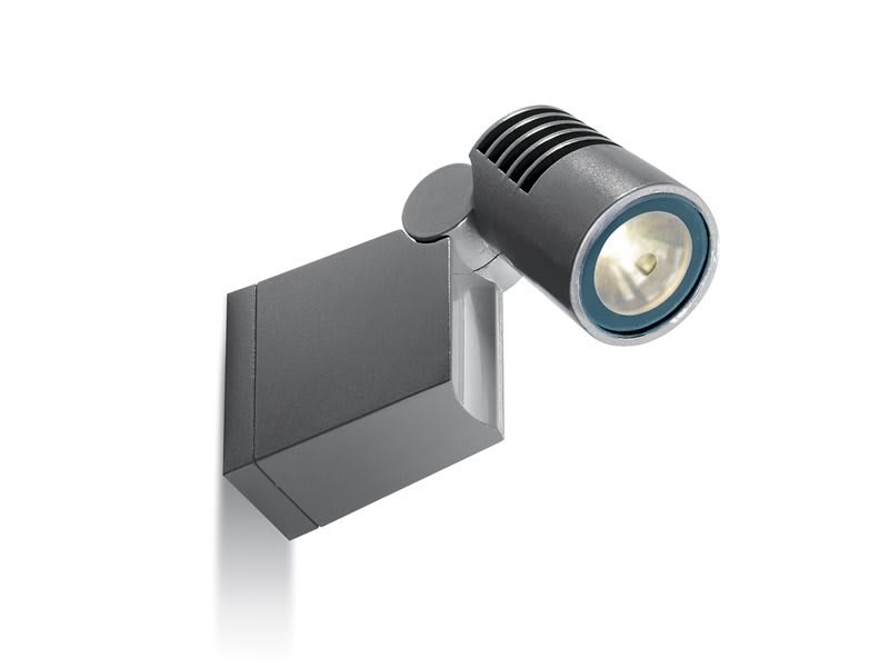 Proiettore compatto a LED ad alta emissione. Corpo e snodi in pressofusione di alluminio. Vano ottico alettato per garantire la massima dissipazione del calore. Orientabile di 180° sul piano verticale con bloccaggio meccanico del puntamento e di +/- 45 °sul piano orizzontale tramite staffa di fissaggio. LED ad alta emissione nel colore bianco caldo completo di ottica microsfaccettata in alluminio flood. Completo di staffa di fissaggio a parete. Driver elettronico integrato. Precablato con 1,5 m di cavo H07RN-F. Lampada: LED 8W 3000K. Colore: Ferrite.