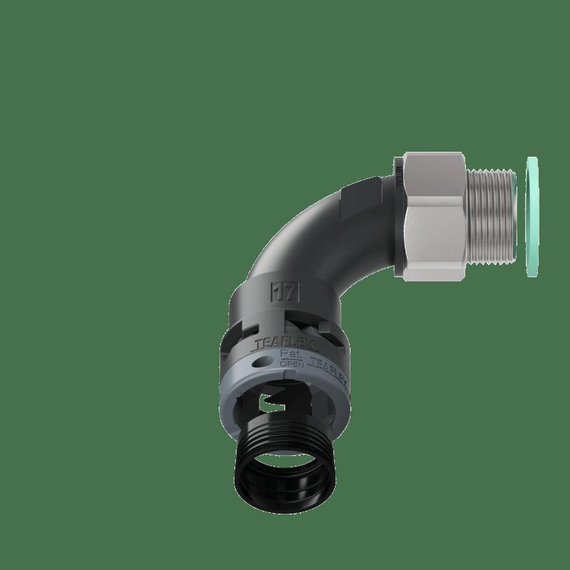 Le curve a 90° con filetto in metallo girevole facilitano in modostrutturale il montaggio di cablaggi preassemblati.La particolare costruzione senza spigoli interni permette un facileinserimento dei cavi annullando la possibilità che gli stessi venganodanneggiati.Le parti girevoli del raccordo riducono i movimenti torsionalidelle guaine aumentando la durata nel tempo delle connessionisottoposte a movimenti. Inoltre il filetto metallico assicura una piùalta resistenza alla trazione e la possibilità di essere saldamenteancorato con un comune frena filetti.Soddisfano i requisiti standard nelle applicazioni tecniche adelevate prestazioni nell’industria pesante e nel settore ferroviario.