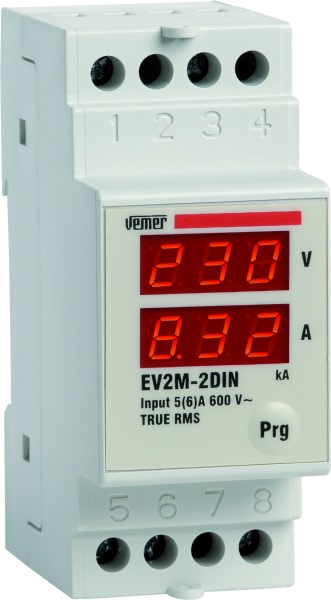 Voltmetro/Amperometro AC con doppio display per la visualizzazione contemporanea delle due grandezze misurate. Principali caratteristiche: • Alimentazione: 230 V AC • Portata: 600V AC / x/5 A AC su TA • Contenitore: 2 moduli DIN • Inserzione di tensione diretta • Inserzione di corrente tramite trasformatore esterno x/5 A.