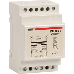 Trasformatore per uso continuo in contenitore 3 moduli DIN • Tensione al primario 230 V AC • Doppio isolamento • Tensione al secondario disponibile nei seguenti valori: 12-24 V • Potenza: 30 VA