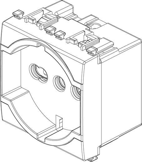 Presa SICURY 2P+T 16 A universale, per eurospine 2P 2,5 A, spine 2P e 2P+T standard italiani 10 A e 16 A, spine 2P+T 16 A. Standard tedesco, - 2 moduli.
