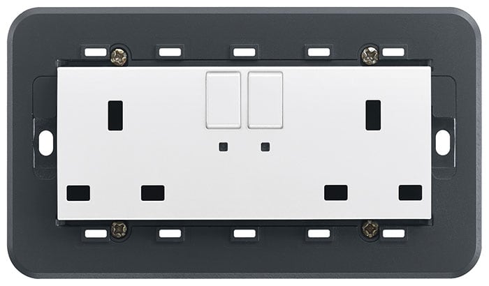 Due prese SICURY 2P+T 13 A 250 V~ standard inglese con due interruttori 2P con spia luminosa, complete di supporto per installazione in scatole rettangolari BS, da completare con placca 5 moduli BS, bianco